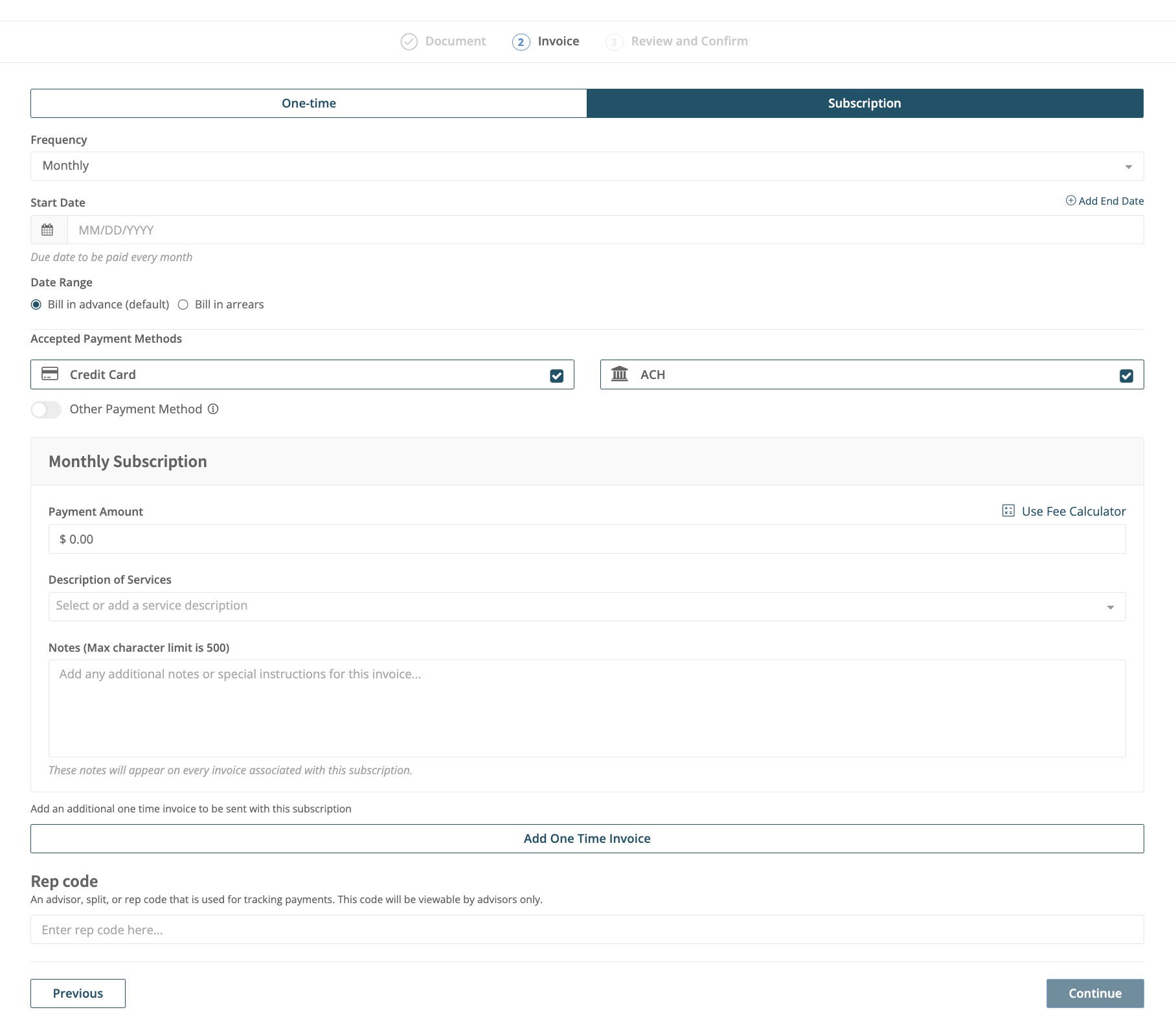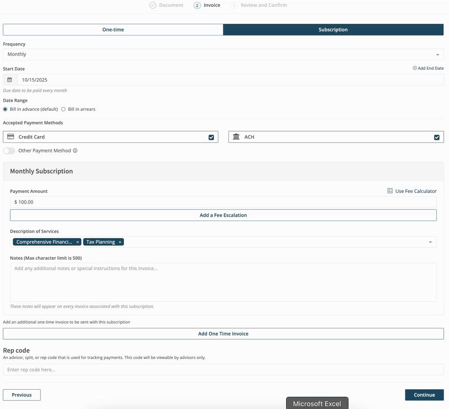 Optional: If creating a subscription, you'll have the option to add an automatic future Fee Escalation if needed (annually).
