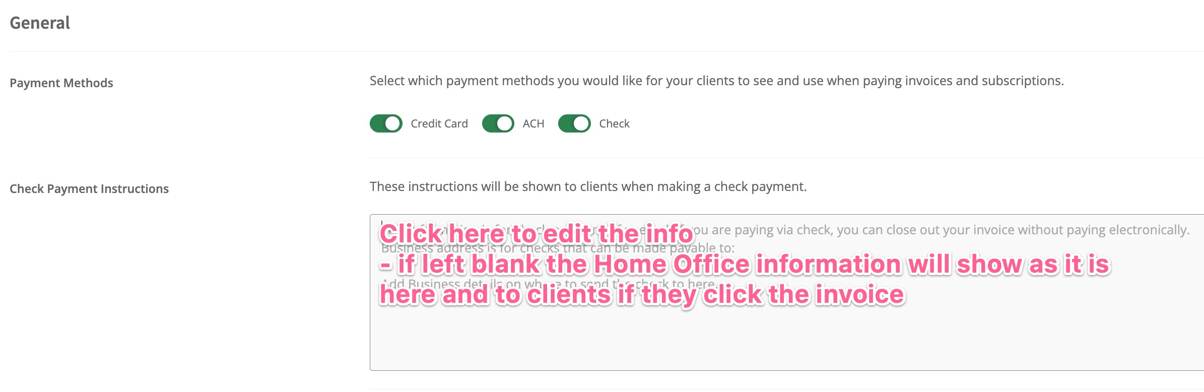 Under Account Settings > Invoice, Payment Methods, select which payment method options you would like for your assigned clients to use when making payments. These can be selected or deselected on each invoice as needed in the request process: