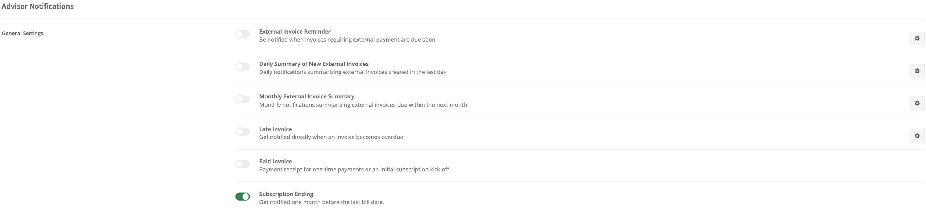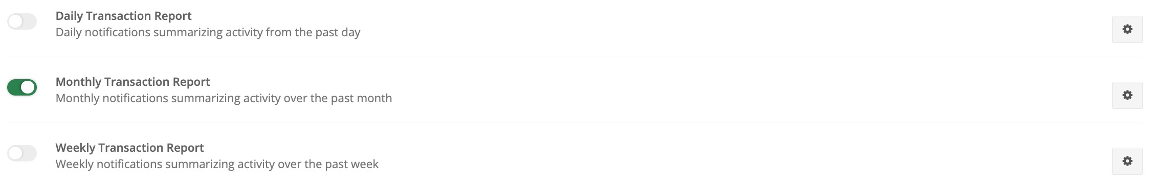 Some settings have a specific number of days you can set for it to send, while others offer an area to add emails for reports. These are located in the gear icons to the right of them, respectively:
