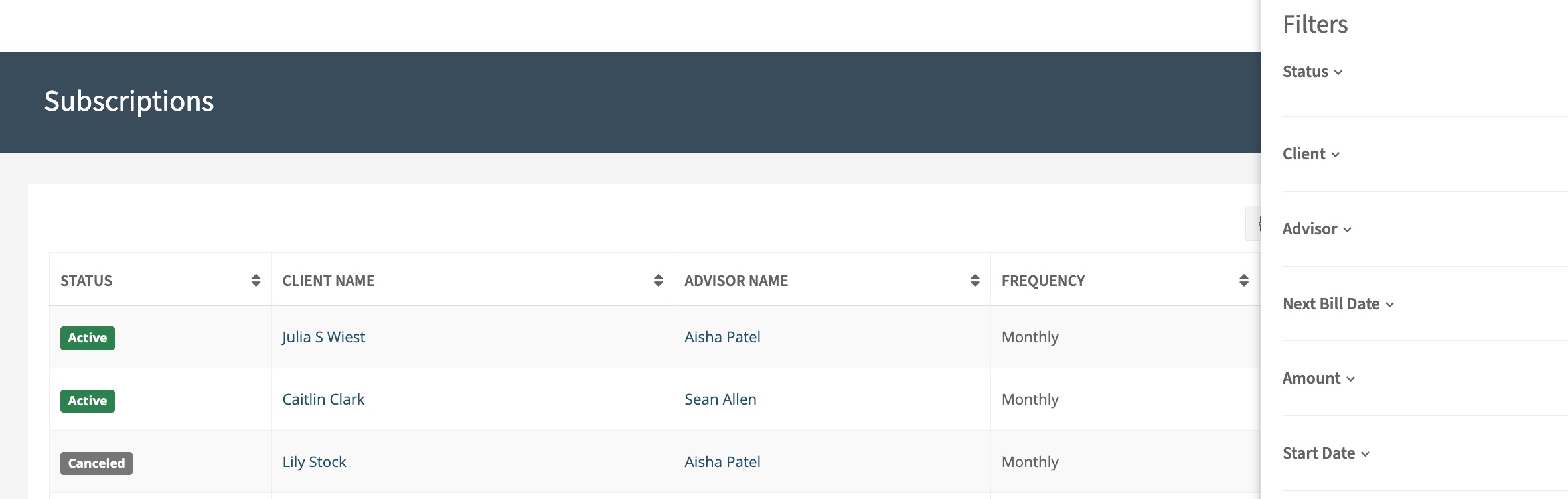 - All active subscriptions for a specific advisor