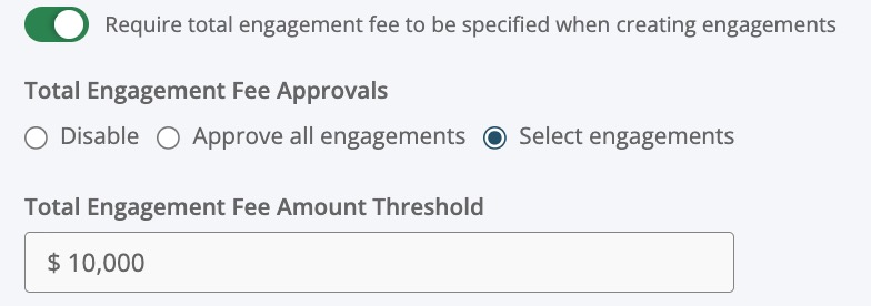 engagements. Note that approvals cannot be turned "on" for invoices and TEF; it must be one or the other. The threshold can be whatever you choose; below is just an example: