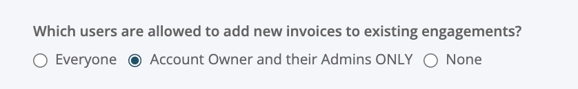- Selecting the Account Owner and their Admins only, they will have the ability to add invoices to existing engagements.