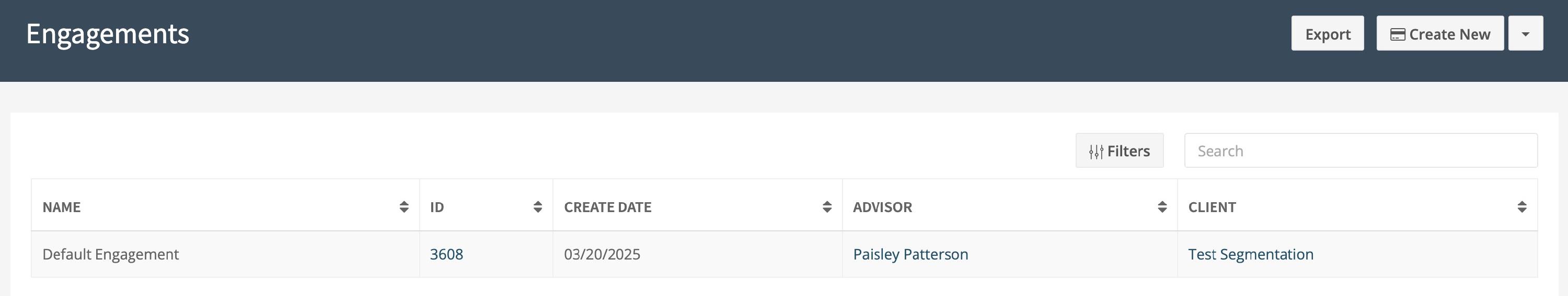 Engagements are listed -- and searchable -- by Engagement Name, ID, Advisor, and Client: