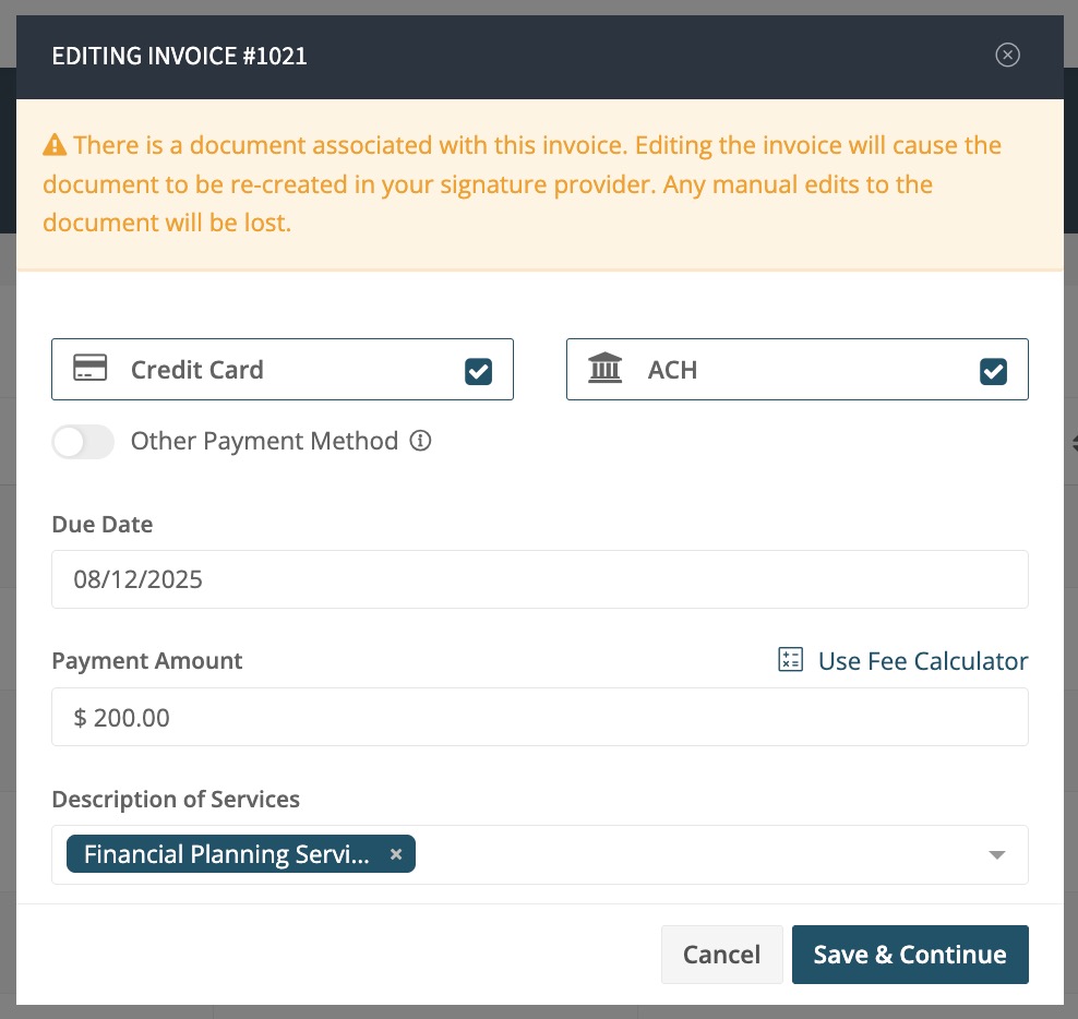- If you have a document attached, the yellow bar will appear on the editing modal. "Editing the invoice will cause the document to be re-created in your signature provider. Any manual edits to the document will be lost due to this process." Please send the email or a reminder in the next modal after editing the invoice.