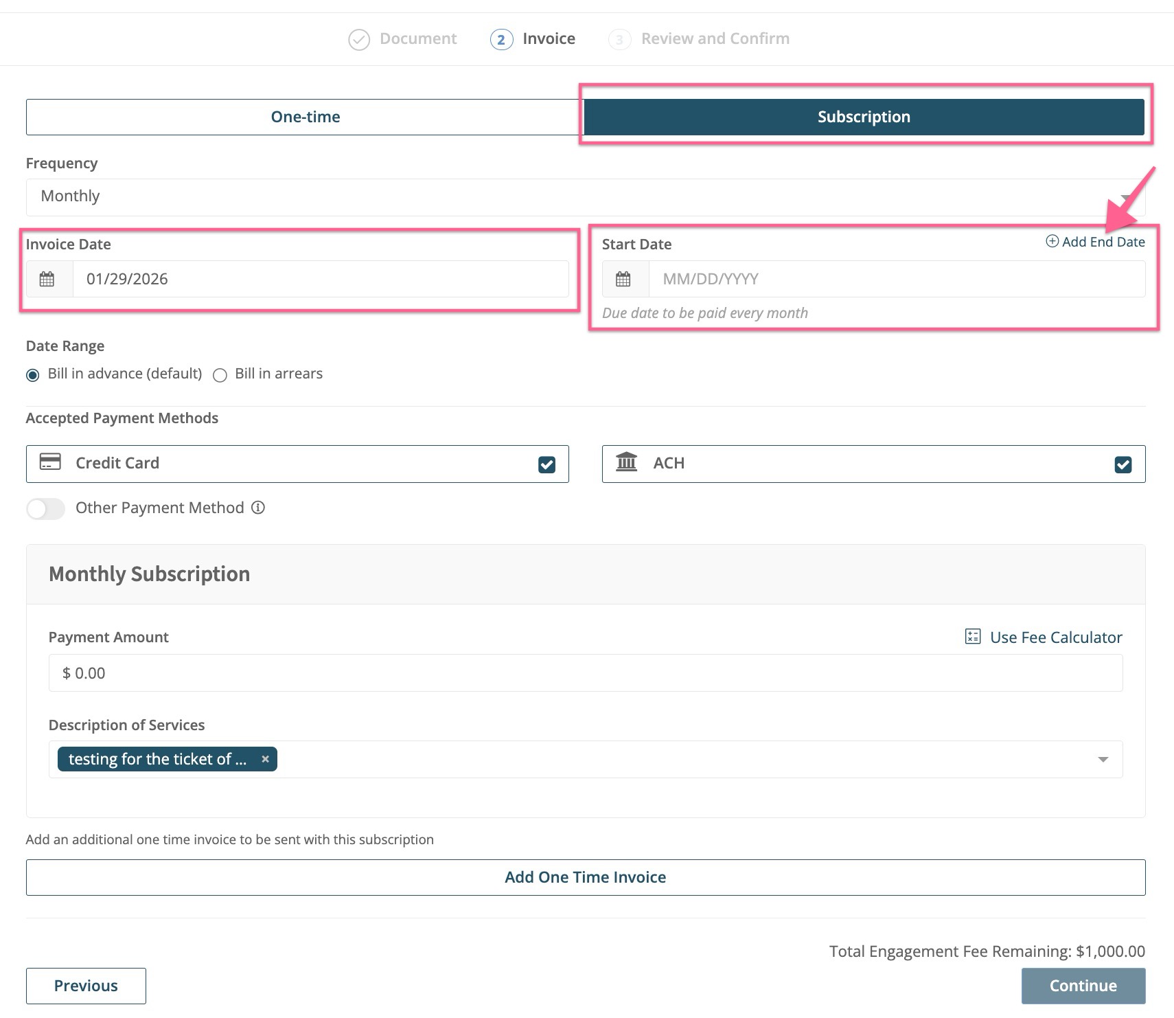 If a document is attached and sent via email, the client can sign. Subscriptions will only become available when the Invoice Date is met, but can be activated prior to the Start Date, but will only begin billing on the set Start Date.